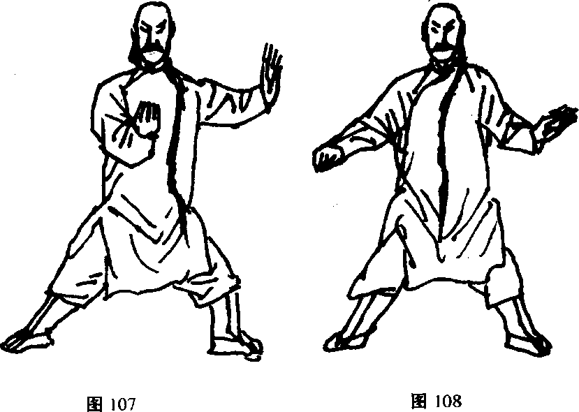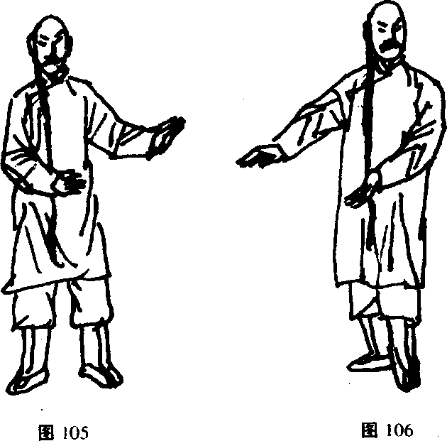 尖上卜成一条直线。右勾手低于右臂,与工却尖上下对照。两臂直 中求曲,尤重六合。弓箭步裆要圆° R为向东(图105~108)。