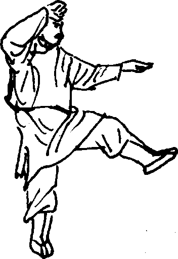 接上式。两掌变拳,随囚身两臂向下转动。向上起时,带动左 脚踢起,以脚面踢手掌,掌与肩平;以脚趾根处击手指根,使之发出 清脆响声。向左踢起时,右臂同时随之转动;右半身下沉,脚跟不能 抬动。脚落地时面向东(图127)。