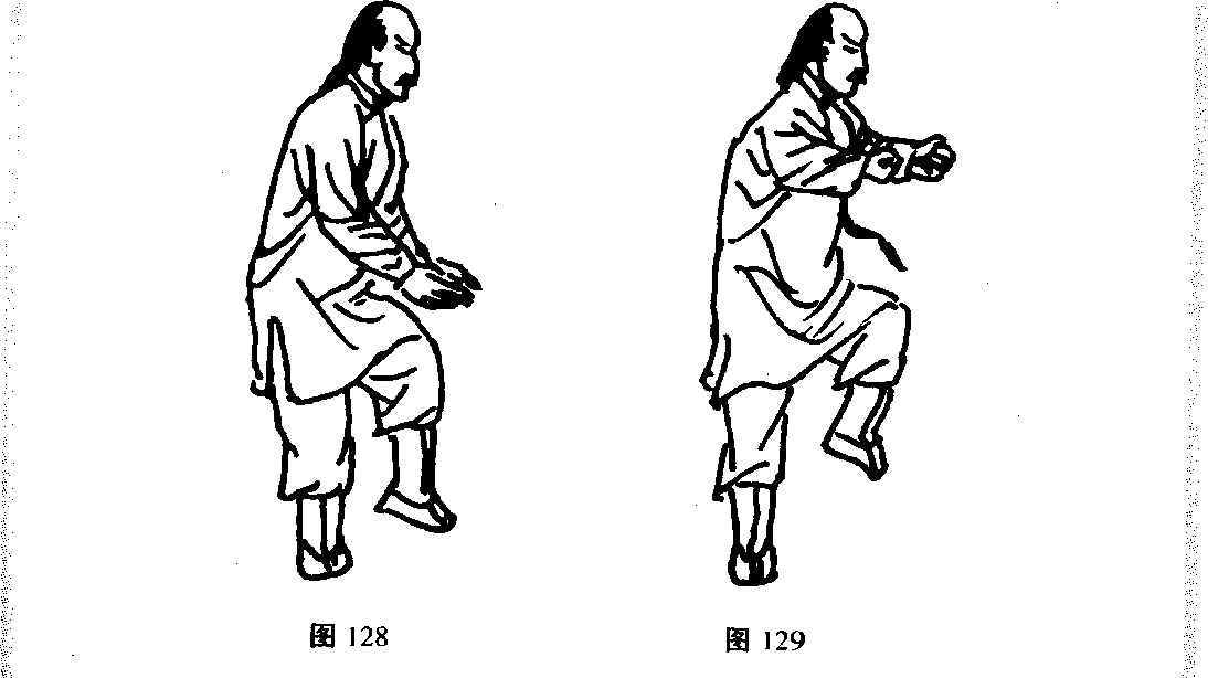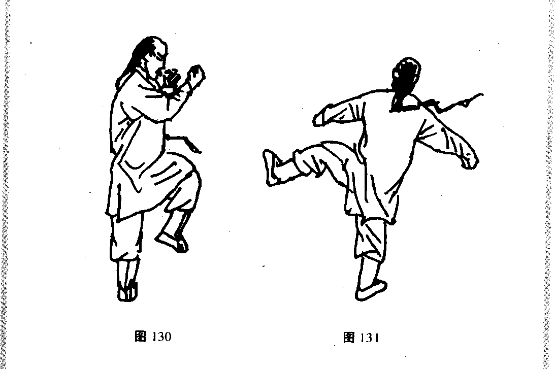 接上式。拍脚后,脚不落地,就势两臂随身下囚向下翻转;向上 提身时,以右脚跟为轴,收两臂;两掌变拳转向西方,两拳收在胸 前。左脚屈在右腿根,右腿微屈独立;两臂两拳向外撕扯式击出。 同时左脚由右腿根绕圆向左侧蹬出。脚尖向上,脚跟与胯蹬平。松 右胯,蹬出时用力。而向西(图128 ~ 131)。