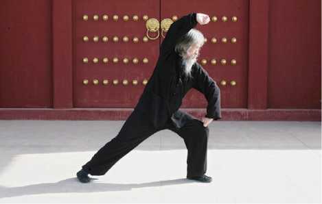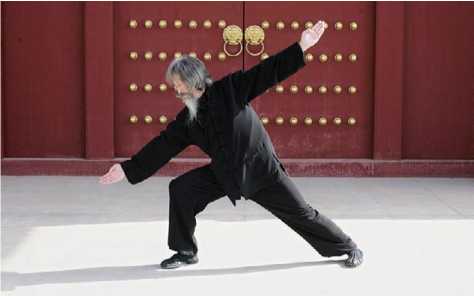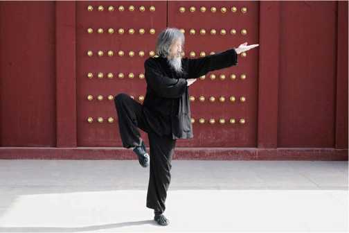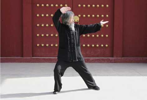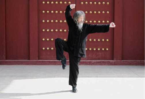 将右足一■抬,身落独立式,右掌往左肩前一■ 按至左腋下,左掌仰着往东穿与眉平,面往东 视。