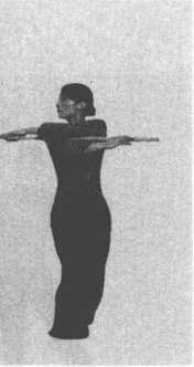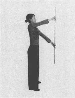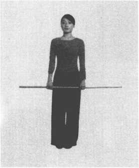 3. 两腿蹬直,右转90。还原成动作1,右臂在上, 左臂在下,于体前举竖棍。