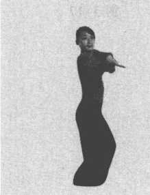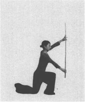 2. 右腿并左腿,同时屈 膝;左臂经上向右划成两臂 胸前交叉,左臂在上,右臂 在下;眼看右侧。(图 3-20.图 3-20 附图)