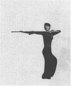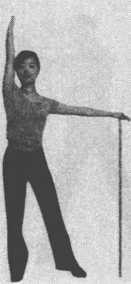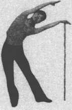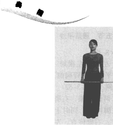 练方习法:两脚开立,左手握棍体侧撑地,右臂上举 贴耳,深吸气。呼气时,甑向右,上体向左屈,保持自然 呼吸,在呼气时加大侧屈的幅度。同样方法,交换方向练 习。(图 3-50、图 3-51)