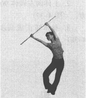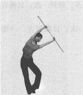 练习方法:右腿直立,左腿屈膝外开,脚尖点地,脚 底贴于右脚踝内侧,保持两臂上举正握棍,身体向左侧 屈,保持动作,3~5次呼吸。(图4-34、图4-35)