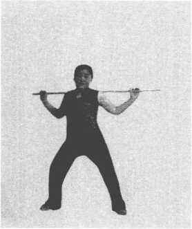 1. 左脚向左跨步成马步,屈伸一次;同时,两臂经 前向上至肩后背棍。(图4-36)