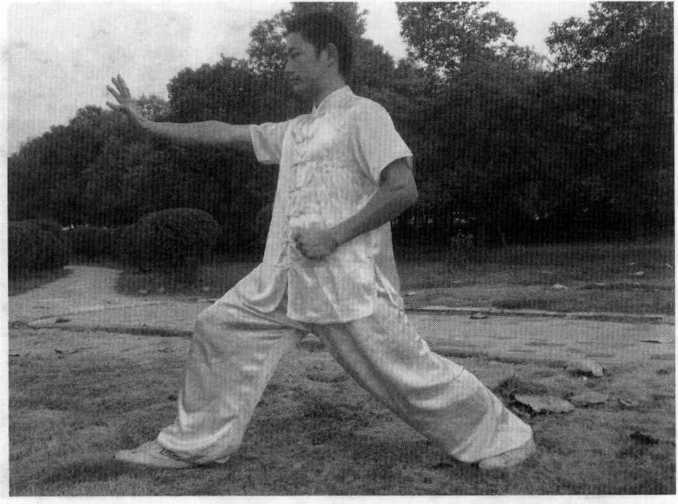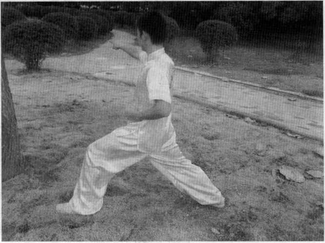 右拳变圆形掌向左侧防抓同时收左手于腹部防护。右腿向前方上一弓步。(图5-47)