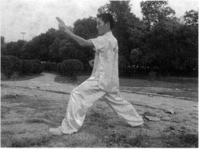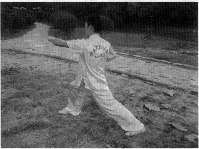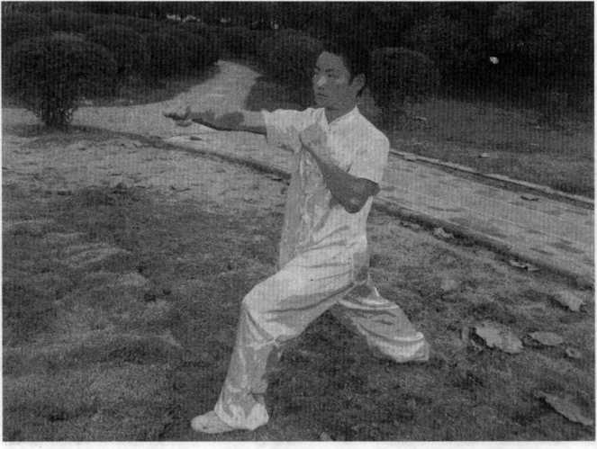 (二十二)点目起腿左脚向前落地成左弓步,并收左拳于胸前,同时右手变剑指掌向右侧敌双眼击点。(图5-50)