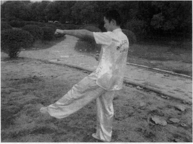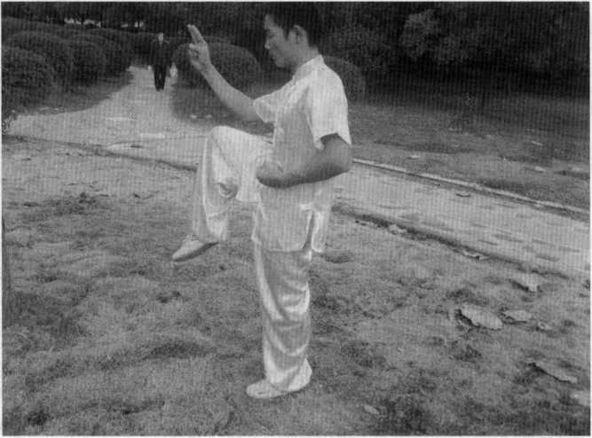 然后重心移至左腿同时起右腿膝盖抬起与大腿相平左手防于左肋部右掌向上向胸前收回,掌指向上与面相平。(图5-51)