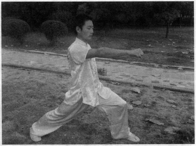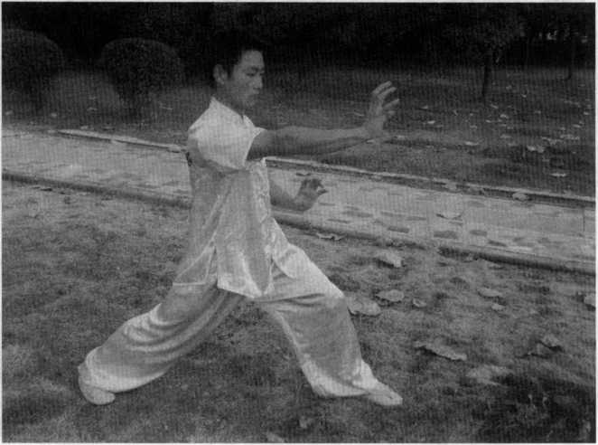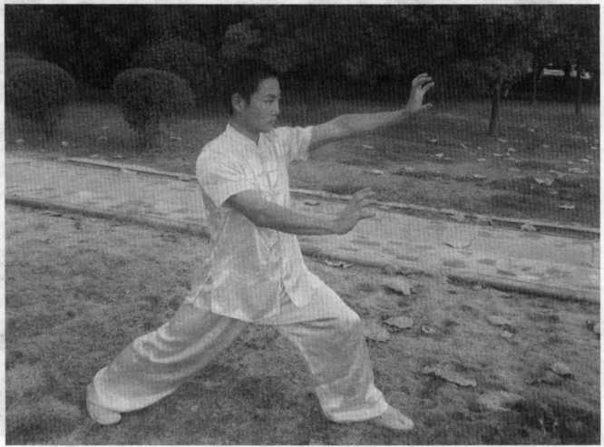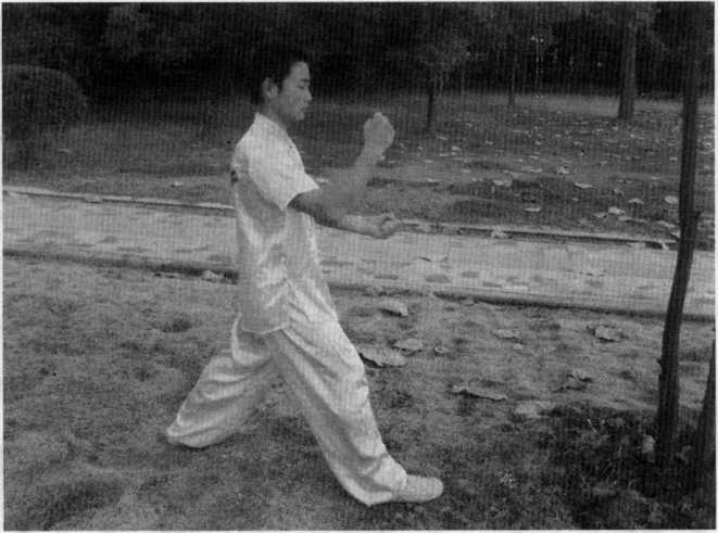 (图5-52)然后左腿由后向前上成弓步同时出右手空心立拳向前方敌胸部鸠尾穴击打左手于胸部防护。(图5-53)(二十四)剑指三锁喉右拳变圆形掌向右上侧防抓(图5-54),并出左手剑指掌向对方颈部人迎穴击点。(图5-54)然后,左手向外防抓左腿向右前方上一弓步同时出右手剑指掌向对方颈部人迎穴击点。(图5-55)