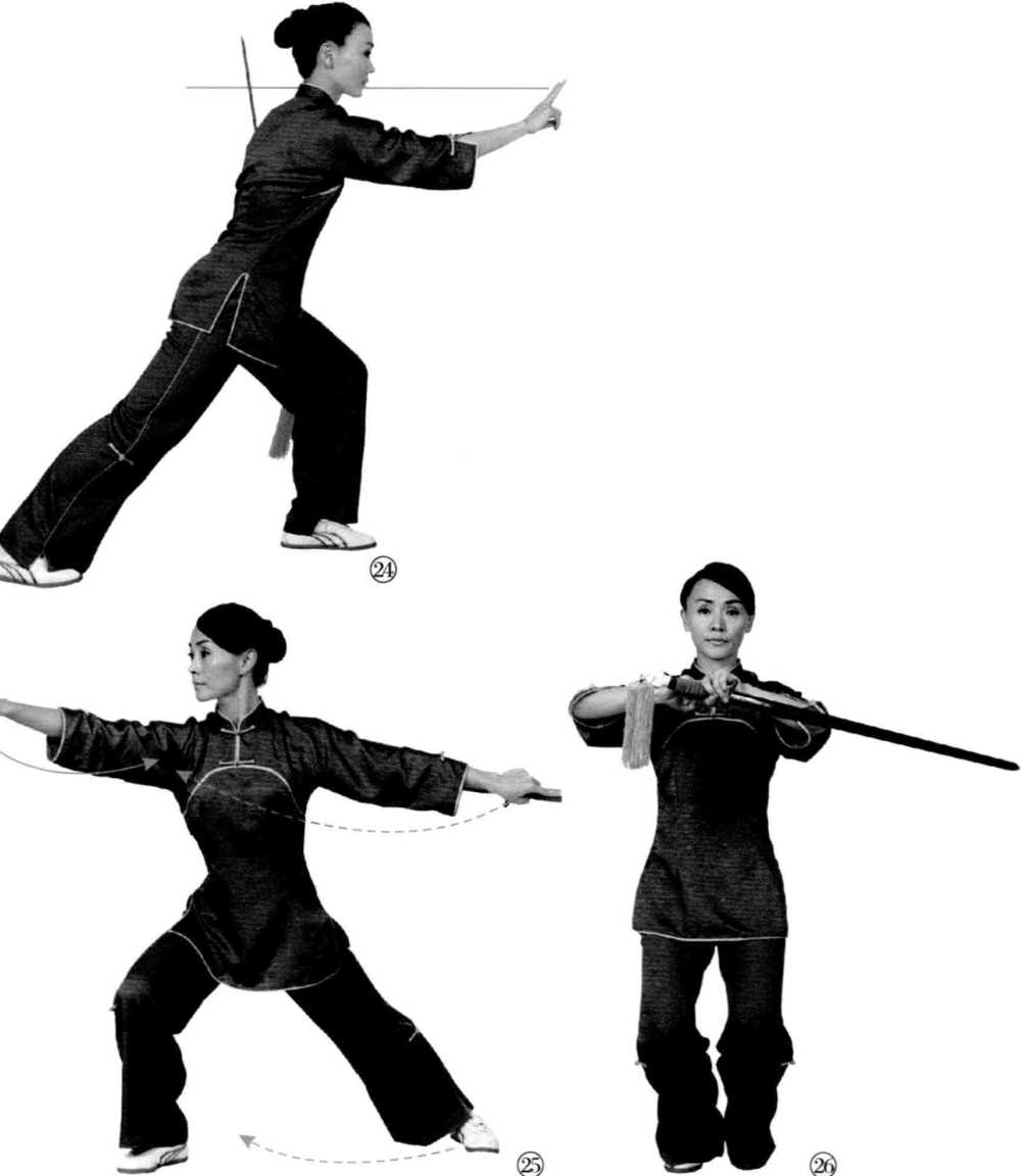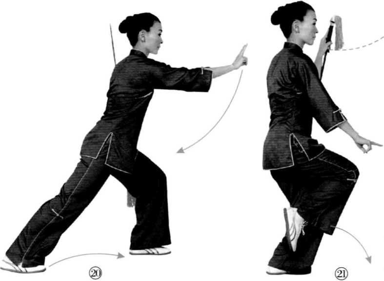 剑诀向左前下,指 与膝平,视线随剑诀动, 上身微前俯。同时松左 肘,小臂上举,剑镇向上 至左耳旁,抬头,立腰, 右脚回收至左脚旁。意在 剑诀。(图21)