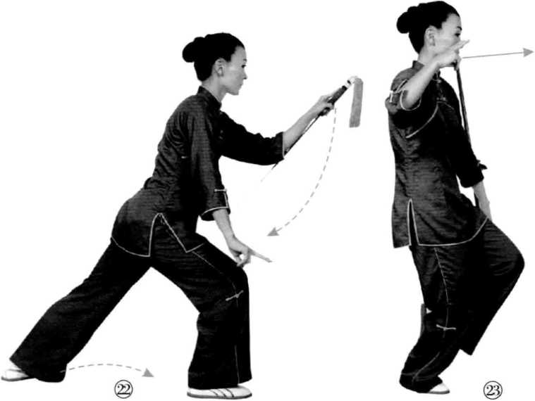 18 ?用袍拨剑动作同14。(图23)18 ?用袍拨剑动作同14。(图23)右脚向前迈步,左 手用剑镖向右脚上方指 出,过右脚的上方时脚落 平。剑镖继续前进至臂舒 直,高与喉平,剑平贴于 臂外。弓右膝,重心前移 成右正步弓势。同时,剑 诀向右后下落,垂于右腿 外侧。视线向正前方,意 在剑露(图22)