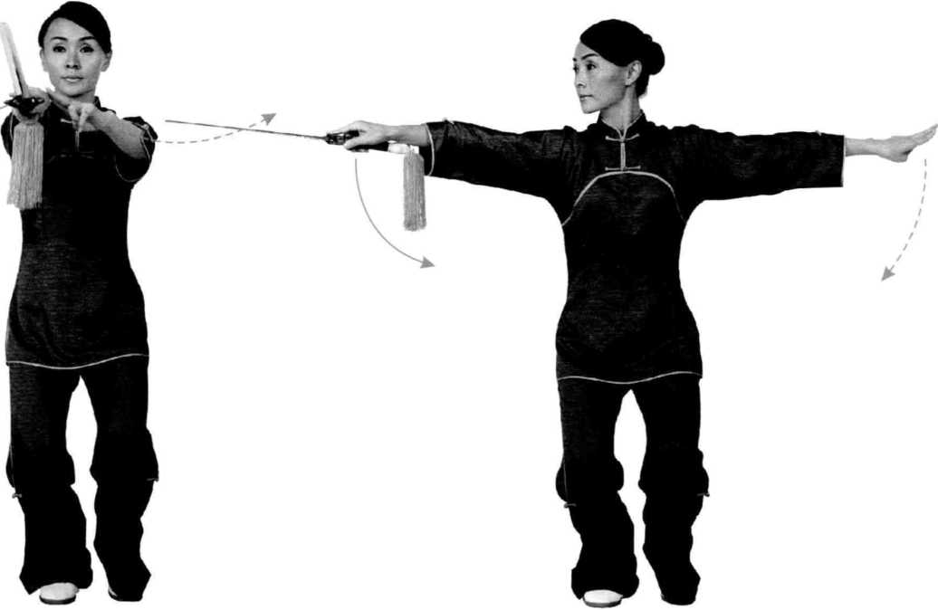 右手从左手上方绕至握柄处接 剑,用剑前刃平着向前伸斩,左手微向 前送出一段后变为剑诀前指。两手与肩 平,手心都朝下。视线正前平远视,意 在下前刃。(图1)