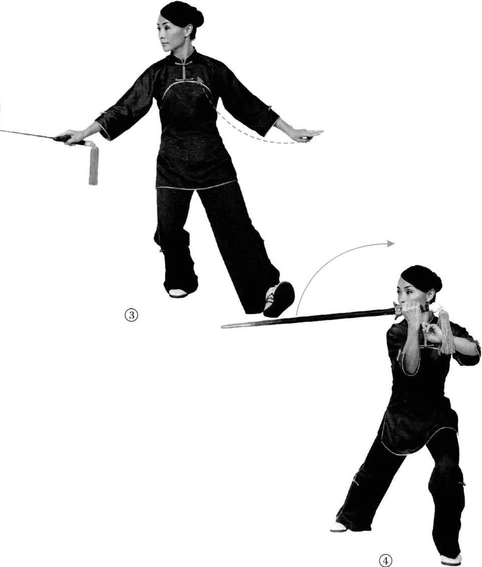 右手剑用下中刃向前上撩托,手心朝 里,剑身要平,高与喉平。同时弓左膝, 重心前移,剑诀往上贴于右腕处。眼顺剑 尖向右远视,意在下中刃。(图4)