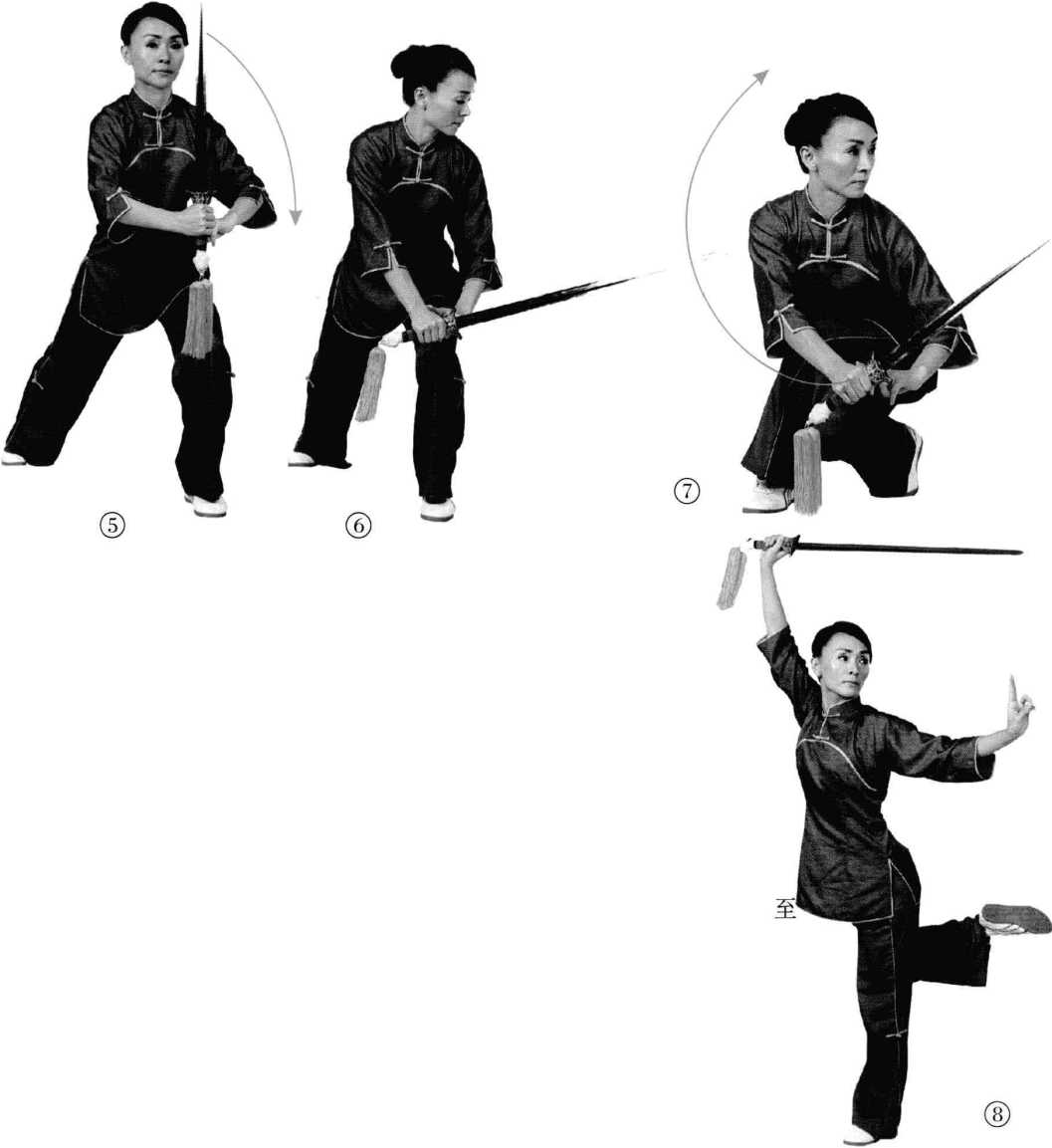 右手向右上方移剑镇, 右前45度的位置,剑身平;剑 诀向左平指。同时,起身,将 重心转移至左脚,右腿向上抬 至大腿与上身成水平状,小腿 斜上,脚心朝天。眼神向左上 方远视,意在剑诀。(图8)