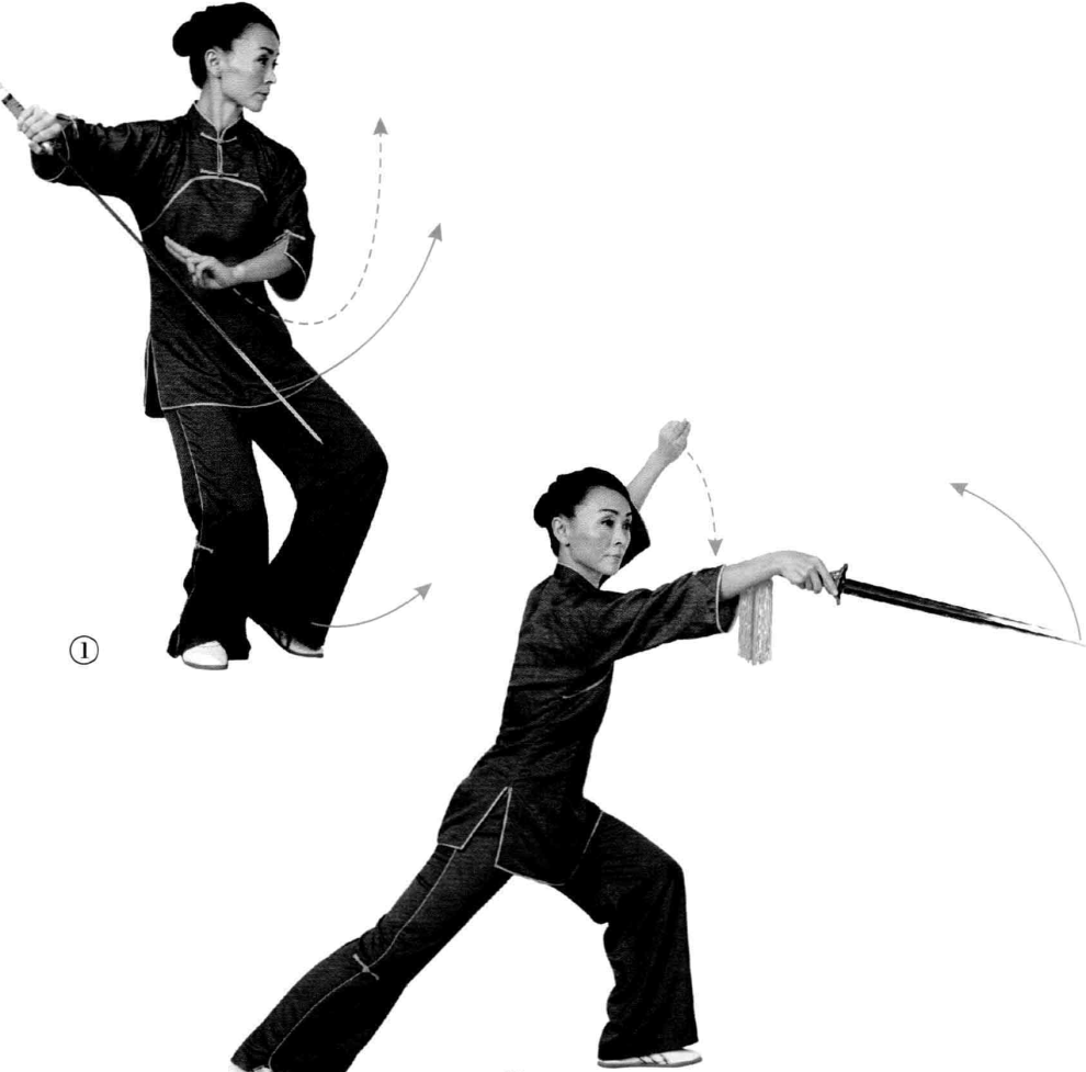 右手剑以剑尖引领往左前上。同时,左脚往左前上 步,弓膝,重心前移,展右脚跟成右隅步弓势。同时, 剑尖继续上提,松腕用剑尖下点,与鼻平,剑身与臂要 直。同时,剑诀搂左膝后,向左前上过顶至左眉梢斜上 方,屈臂呈半圆形,视线随剑尖动。(图2)