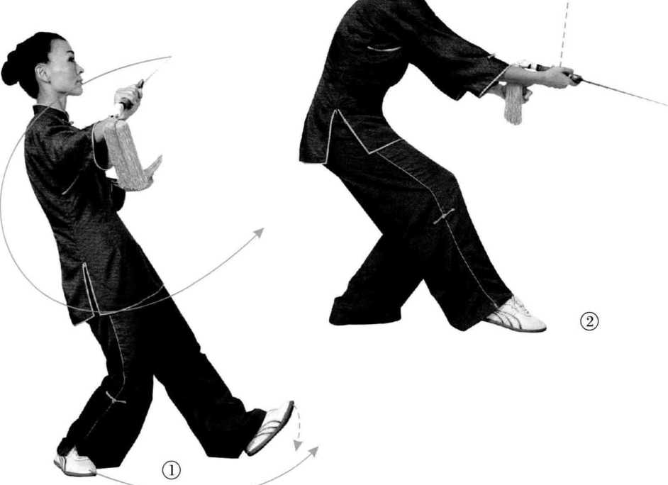 右脚尖往里扣,尾闾往右下转。视线离开剑尖向左 移,带动身体左转,收左脚。同时,右手剑的剑尖下落 至右膝外,剑诀往下经左膝上至左肘里侧。(图1)
