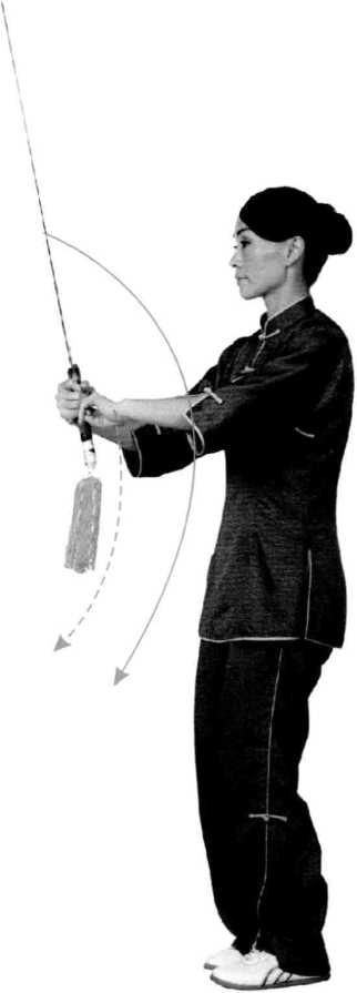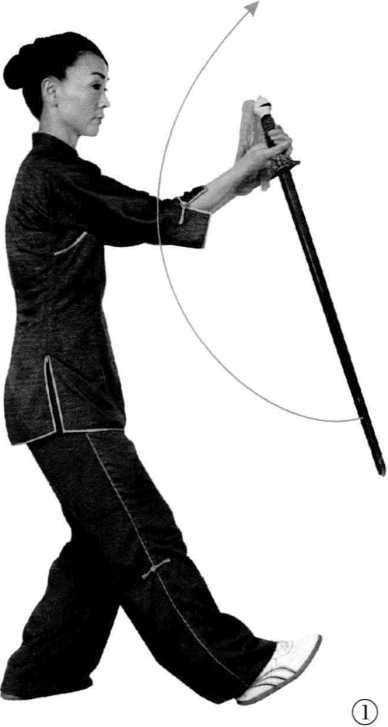 右手向上提剑把,手心外翻,剑 尖下垂。同时,长身起立,左腿站直, 右脚虚着地,使剑根部在右肩外,剑诀 上贴于右小指根部,眼神从剑根向外 看。(图1)