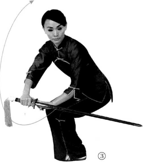 身体下蹲,右手剑以中刃下压在 左膝外侧,剑诀贴于右手背。视线向 前。(图3)