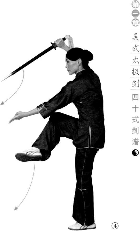 右手剑以中刃向外上提撩,虎口朝 下,右臂舒直。同时,长身站直,左腿 独立,右膝上提,小腿前抬。剑诀向前 下指,手心朝外。眼正前平视。(图4)