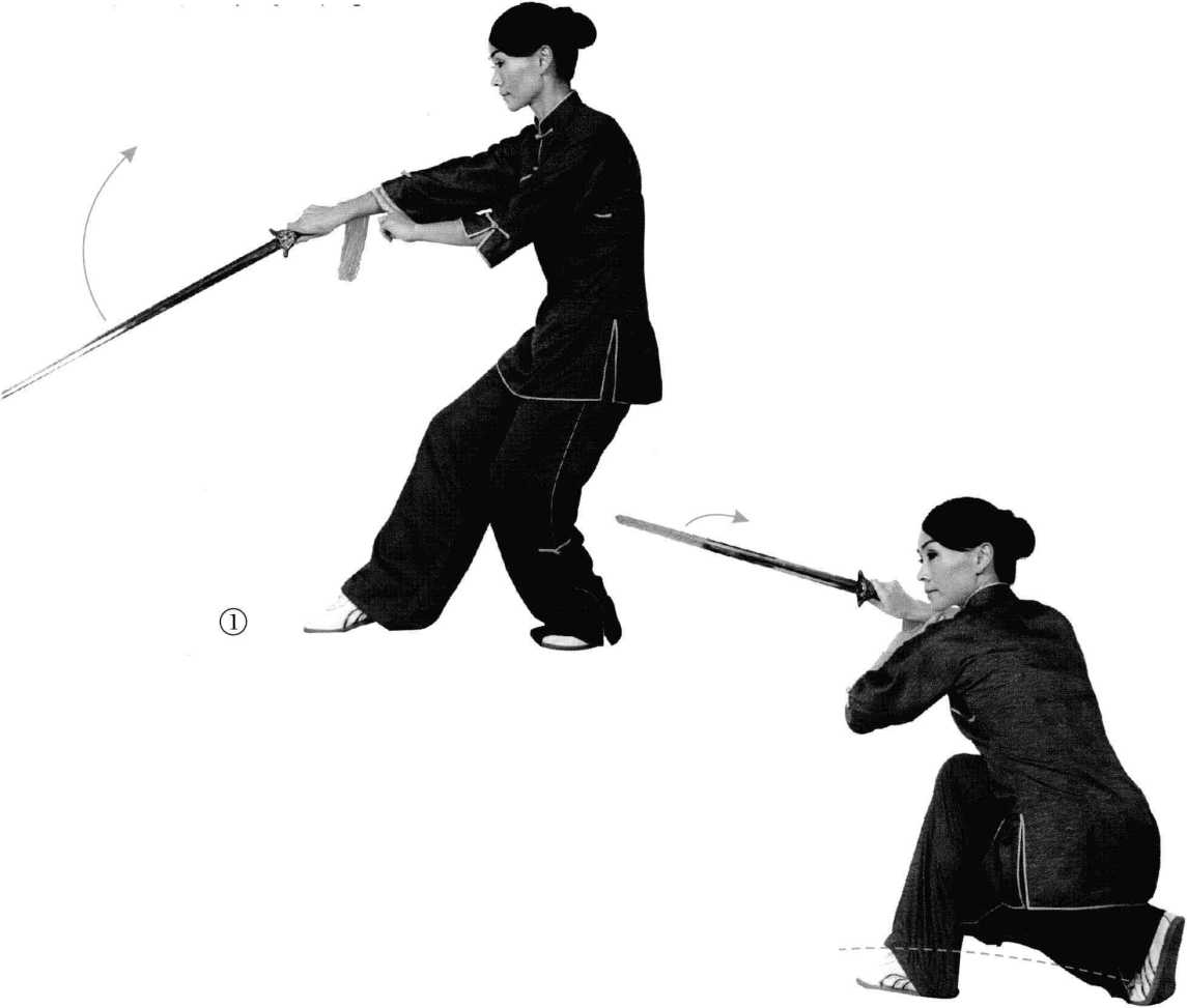 如对方转至我背后,用兵器袭 击我头部,我即长身起立,用剑根 拦接,再往后旋剑尖削其手。转过 身蹲压其兵器,当对方退时,起身 用剑中刃上撩其握兵器的手。
