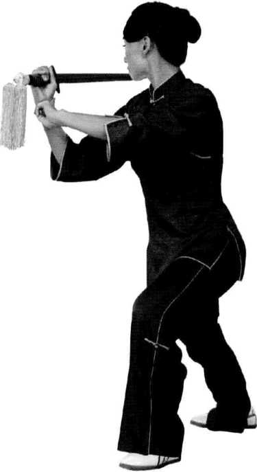 屈左腿,重心后移。同时,两手握剑把下撤 至右膝前,剑尖斜上翘,视线平前。然后,右手 剑向左划弧。同时,左转身右脚变虚步,视线随 剑动。左手松开剑把后变为剑诀,下至左肋处, 手心朝上。(图1)