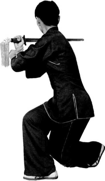 右手往后撤,坐腕以剑上尖向后反 剪到右肩之后外,臂微弯曲。同时,身 微前移,往回转身回顾剑尖,剑诀贴手 腕处。(图1)