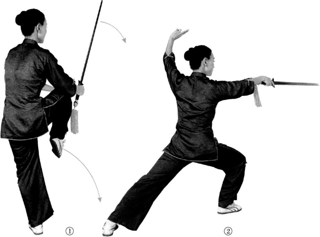 两手握剑,剑尖上立,旋转钻天。起 身体,提右膝,以左脚跟为轴往右转。长 身向上起,面朝东北,脚尖朝北,视线平 前。(图1)