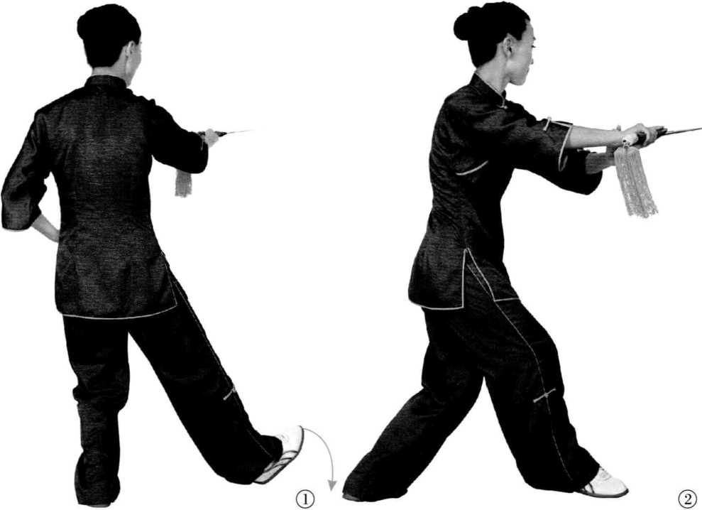 右手剑以剑根向右后翻转外拨,同时, 右脚往右前迈,弓右膝,重心移右腿。视 线、身体皆右转,剑诀指向右手腕。(图2)