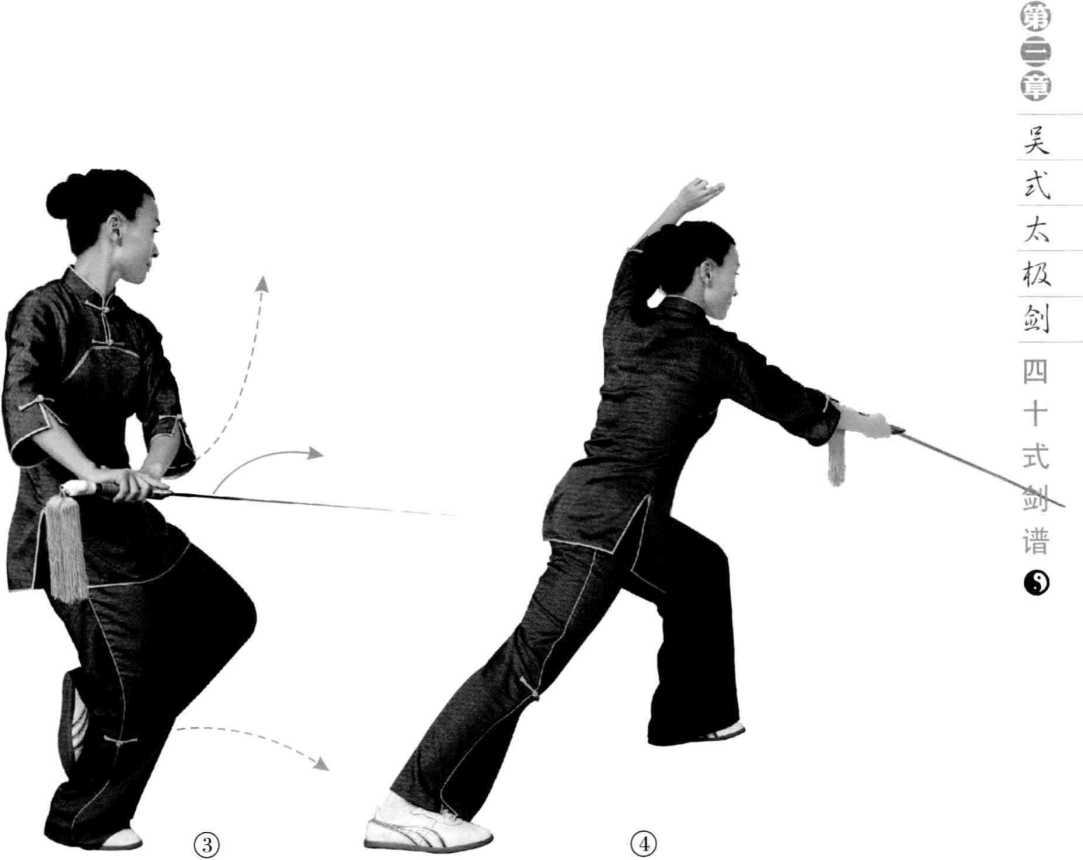 右手剑从右后经右肋下穿出,以剑尖经左脚 上边向正北平剑下刺,剑尖与左踝平。剑诀向前 搂左膝,左脚往左前上步,重心前移,成脚尖朝 东的左隅步弓势。剑诀搂左膝后,向左前上,至 左眉梢斜上外方,视线随剑动。(图3、4)