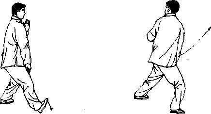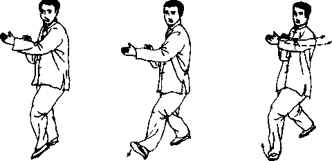 蹬右腿,弓步进身时,上身正直平行前进,不能俯仰、起 伏。