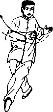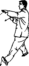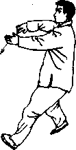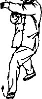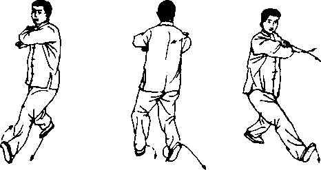 右脚尖点地,左脚尖内扣,身继续向右后翻转,右脚向东 南方上步时,身体不能摇晃、俯仰、起伏、扭曲、歪斜。右脚跟落 地前,身体重心应稳在左腿。