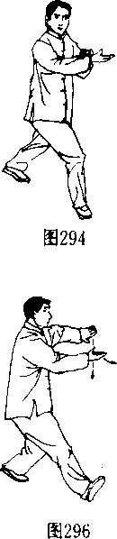 蹬直左腿,弓右膝,身体往东南方前移成右弓步。同时右 手沿水平方向往前糊出。左手俯掌,贴于右腕内侧,两掌随进 身往前挤出。目视双掌。(图294)
