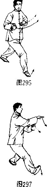身体继续向右拧转,蹬直左腿,弓有膝,身体往东南方向 前移成右弓步。同时右臂内旋,翻掌心荷外。左掌仍置于右腕 下侧,双掌随进身往前推出。目光随双掌,至定势时目视前方。 (图 298)