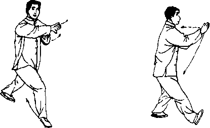蹬直左腿,弓右膝,身体往西北方前移成右弓步。?同时右 手沿水平方向往前捆出。左手俯掌,贴于右腕内侧。两掌随进 身往前挤出。目视双掌。(图313)