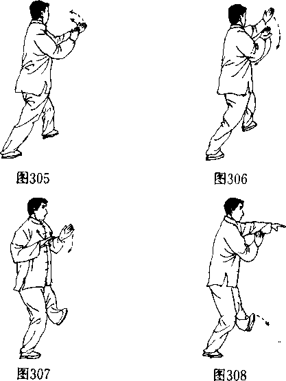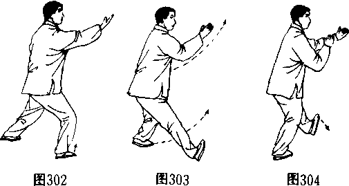 上身姿势不动,右脚尖点地,左脚尖极力内扣,身向右后 翻转,面向西北方。坐实左腿,提起右腿,右脚向西北方上步, 脚跟虚着地。目视前方。(图312)