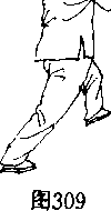 上身姿势不动,左脚尖极力内扣落地,身向右后翻转,重 心落实于左腿,坐实左腿。提右腿,右脚尖于左脚后落地。(图 311)
