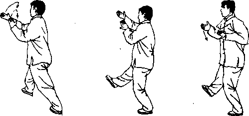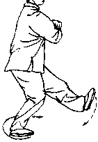 提左腿往西南方向上步时,身体不能晃动,脚跟落地以 前,身体重心仍稳在右腿。