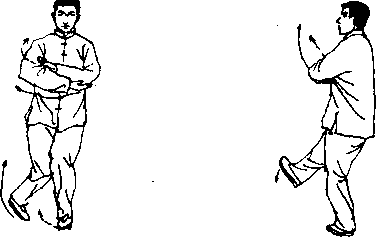 身略向左转并后坐,重心落实于左腿。提右腿,右脚收回 半步,脚跟虚着地。面朝东方。同时右臂外旋,右掌划回置胸