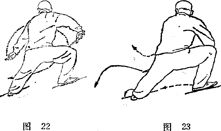 (1) 左腿提起向右腿后(西北)退一步,左剑指经腋下 向左后下反穿;同时,右手翻剑尖向下;眼看左下方(图 22) o(2) 重心下降成左仆步;同时,右手剑向左下穿刺,左 剑指翻手心向上向里落于右手腕;眼看剑尖(图23) o要点:左腿提起退步时,右腿屈膝。仆步穿剑和左手压 腕要同时完成。用法:If身向下穿击对方小腿Q