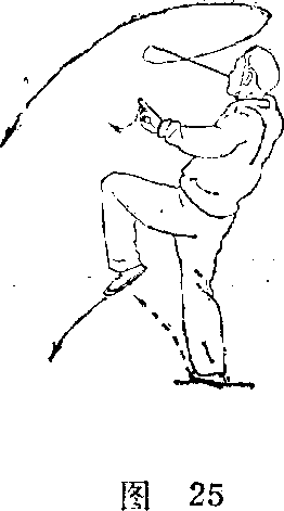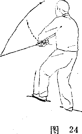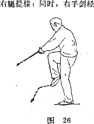 (2) 身体后仰,左腿抬起;同时,右手翻手心向下,剑 横平于胸前,剑尖向左,左剑指向左分开;眼看剑身(图 25) o .