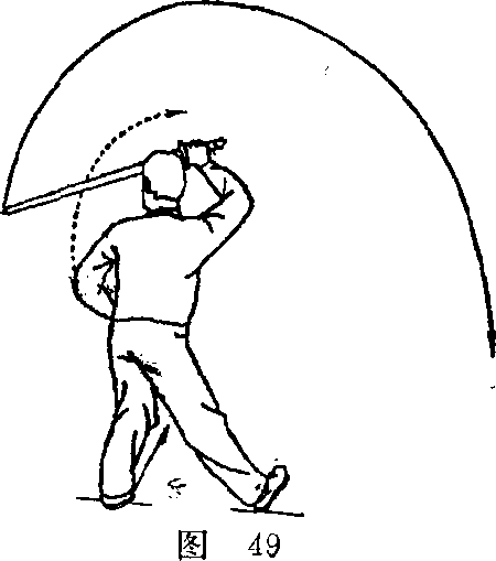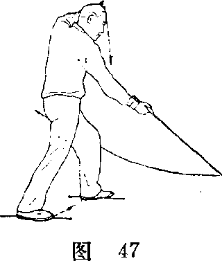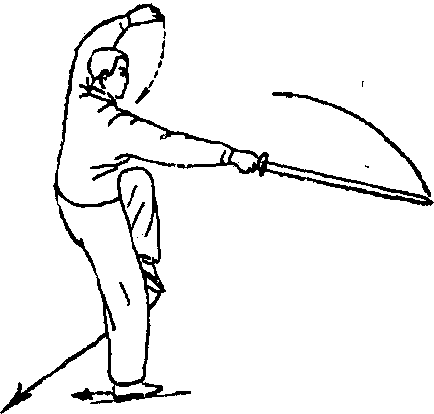 (3)重心前移,右 腿独立,左腿屈膝提 起;身体右转;同时, 右手剑向前下方劈, 左剑指向左后弧形摆至 头左侧上方,手心斜 向上;眼肴剑尖(图 50) o