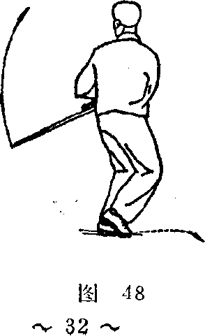 (1) 右脚收至左脚内侧,脚尖着地;身体左转;同时, 右手抡剑由前向下,向后划弧,立剑斜置于身体左下方',左 剑指下落附于右手腕;眼向后看(图48) o
