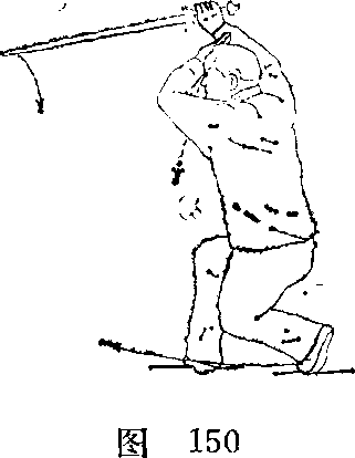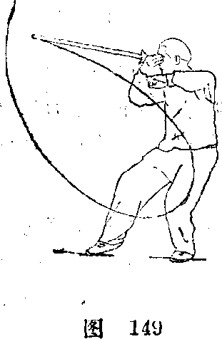 (1)重心后移,身体微 /向左转;右脚收回,成右虚 务V商时,右手剑向左后抽 拉于商前,'左剑指附于右羊:H 「 ’ I腕;眼看剑尖(图149) 0(2)右脚前移,脚尖外撇;身体右转(北),阳腿弯屈,左脚跟离地,成歇步 同时,右手剑向下、向前打 于头上右侧,剑尖向前,左 剑指仍附于右手腕;眼向前看(图150) o要点:剑向后抽扯与撩剑辑身成歇步,要身剑合一。 用法:抽扯对方来刺,舞身撩其手腕。
