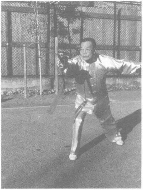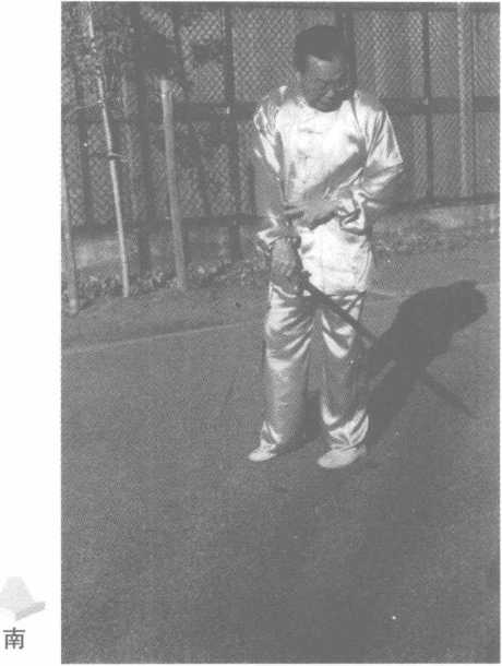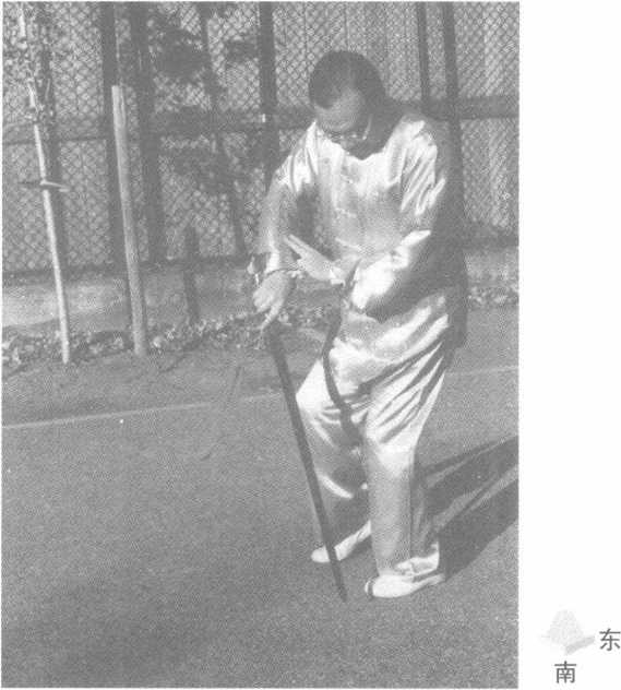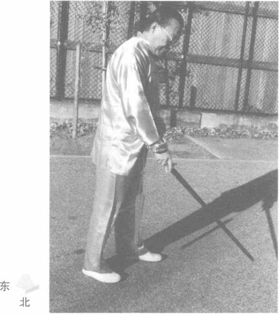 右脚上步,重心渐渐前 移,脚尖向西;继而扣左脚,同 时右手持剑由下向上划圆向 下抡劈,剑把停在左腰旁,剑 尖斜向下,左手剑指附于右 腕,回首视剑尖。