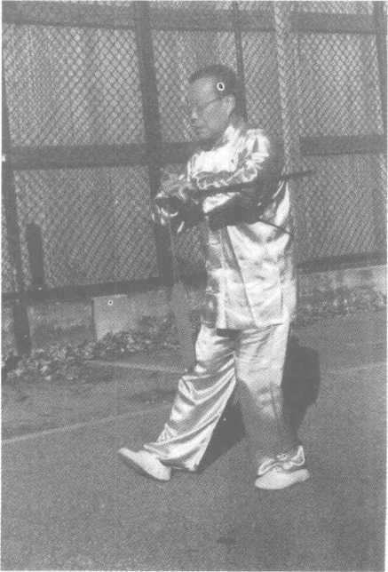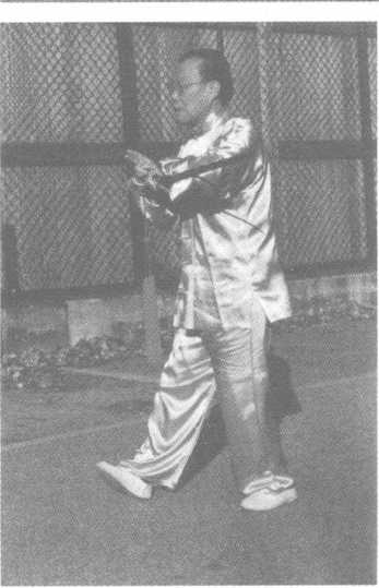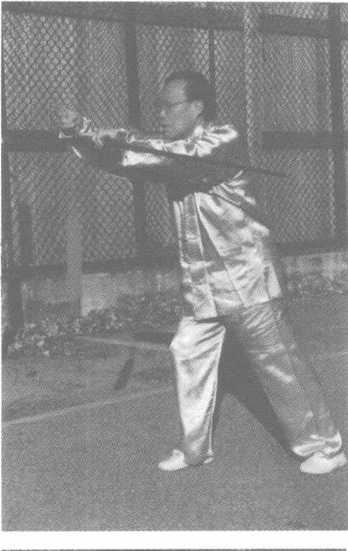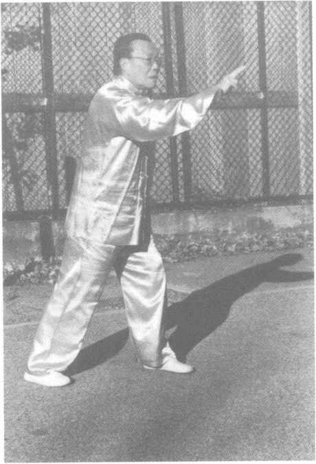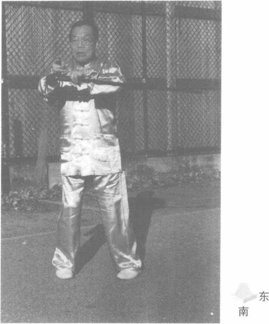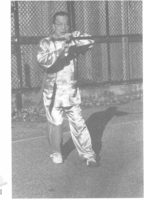 右脚先外旋向南,重 心再移回右腿;左脚内旋 上步,成左虚步;同时,两 臂屈肘,左前臂点剑背,剑 尖向东,右手剑指按于左 手腕,眼视右剑指前方。