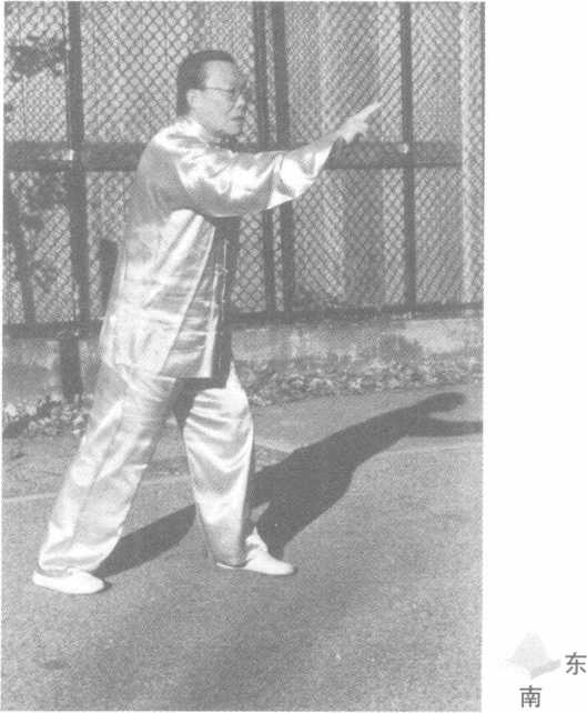 右脚跟内扣,重心移近 右腿成左虚步,同时腰向左 转90。,右手剑指向上,坐腕 于剑柄上首,双手齐向南推 出,眼视剑指方向。