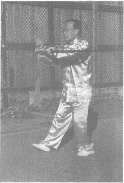 要点:此式呈一圆形走势。前搠挤时呈半弧形,左脚出 蹬力;回握下按时呈半弧形,右脚蹬回,合之成为一个圆 形。全式要上下相随,连而不断,其根在脚,发于腿,主宰于