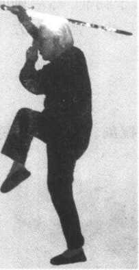 一步,落于右脚前方,两腿成交叉式;同时右手剑,手 心向南扫向东方,划弧形向上提,与剑诀相合,然后 向西劈下,剑诀留在头上方。眼看剑尖(图125)。
