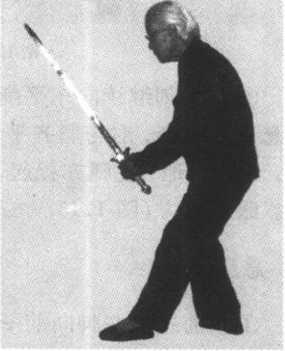 ①接前式。左脚向前一步,右腿下坐;同时右手 剑下劈,与左腿成平行,双手握剑。眼看剑尖(图 122) o