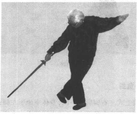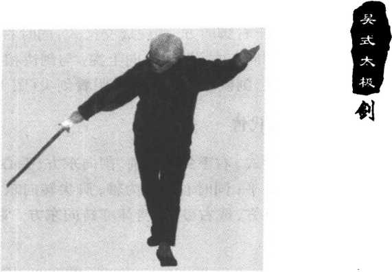 图123图123接前式。右手剑 反手,手心向北,削向 西下方;身体下坐于 右腿;剑诀扬起,手心 向上,停于头上方。眼 看西方(图124) o